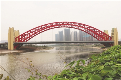 與云龍灣大橋一箭之隔的天保灣大橋全長(zhǎng)880米,主跨230米,橋?qū)?3.5米,采用中承式鋼桁架拱橋施工工藝。目前為成都市同類(lèi)型橋梁中跨度最長(zhǎng)、橋梁樣式新穎、技術(shù)含量高、施工工序復(fù)雜,且跨越錦江涉水施工。