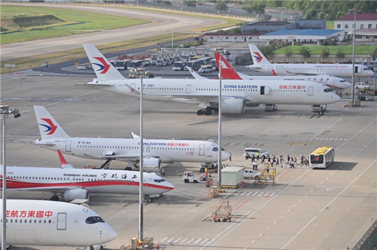 圖說:今日上午,東航接收的兩架C919客機在虹橋機場停機坪上,準(zhǔn)備執(zhí)行滬蓉航線。圖/張弘歷