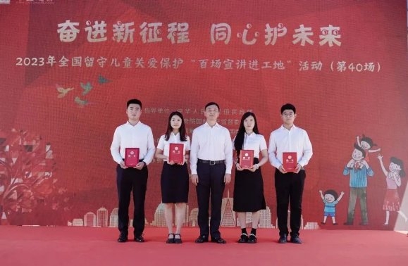 為2023年度全國留守兒童關(guān)愛保護(hù)“百場宣講進(jìn)工地”活動志愿者頒發(fā)聘書