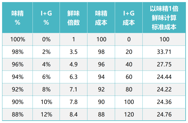 I+G與味精搭配的鮮味呈味倍數成本對照表