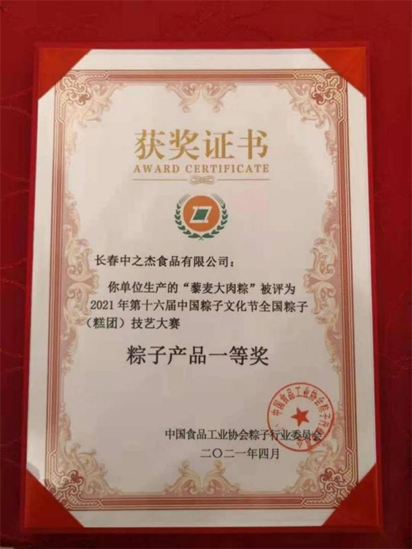 2021年,由中國食品行業(yè)協(xié)會(huì)舉辦的第16屆中國粽子文化節(jié)頒獎(jiǎng)儀式上,中之杰“藜麥大黃米粽”獲得最佳創(chuàng)新獎(jiǎng)、“藜麥大肉粽”獲得一等獎(jiǎng)、“藜麥大黃米湯圓”獲得特等獎(jiǎng),可謂是滿譽(yù)而歸。并且這已經(jīng)是中之杰在中國粽子文化節(jié)上連續(xù)5年蟬聯(lián)最高榮譽(yù)。