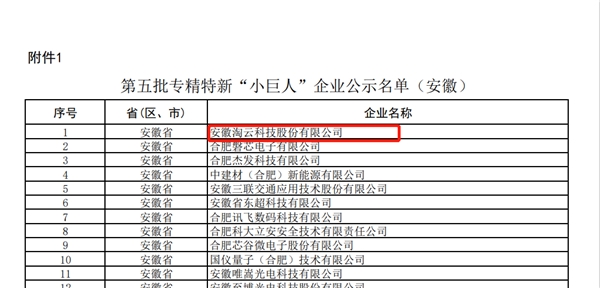 7月21日,工業(yè)和信息化部開(kāi)展的第五批專精特新“小巨人”企業(yè)公示結(jié)束。安徽淘云科技股份有限公司(后稱“淘云科技”)憑借企業(yè)在專業(yè)、精細(xì)、特色、創(chuàng)新等核心競(jìng)爭(zhēng)力領(lǐng)域的出眾表現(xiàn),從眾多參選企業(yè)中脫穎而出,成功獲得第五批國(guó)家級(jí)專精特新“小巨人”的認(rèn)定!