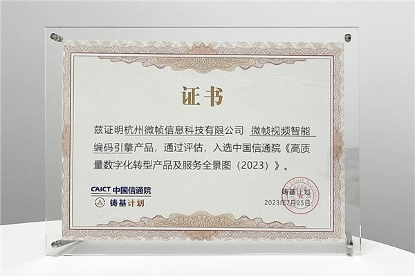 7月27日,由中國信通院主辦的“2023數(shù)字生態(tài)發(fā)展大會”暨中國信通院“鑄基計劃”年中會議在北京召開。本次大會全面總結(jié)了“鑄基計劃”上半年度工作成果,并重磅發(fā)布了《高質(zhì)量數(shù)字化轉(zhuǎn)型產(chǎn)品及服務(wù)全景圖(2023)》。微幀科技作為全球領(lǐng)先的視頻編碼及AI解決方案提供商受邀出席會議,【微幀視頻智能編碼引擎】以行業(yè)領(lǐng)先的編碼性能、不斷突破技術(shù)極限的自研能力,實(shí)力入選全景圖。