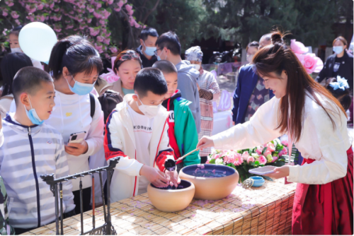 來賓們?cè)谫p櫻的同時(shí)紛紛錄制有聲明信片“我想對(duì)黨說”,體驗(yàn)各式手作、風(fēng)箏制作、DIY團(tuán)扇制作、漢服秀等?!霸搅_衫袂迎春風(fēng),玉刻麒麟腰帶紅。”春色花下,飄逸的裙裾、精致的簪花,中華傳統(tǒng)服飾之美與絢爛多姿的國(guó)潮風(fēng)交相輝映,在水墨香中感受漢字書法的魅力所在,在詩詞之美中,領(lǐng)略詩意人生的寫照、家國(guó)情懷的寄托,傳承詩詞文化,涵養(yǎng)民族精神。