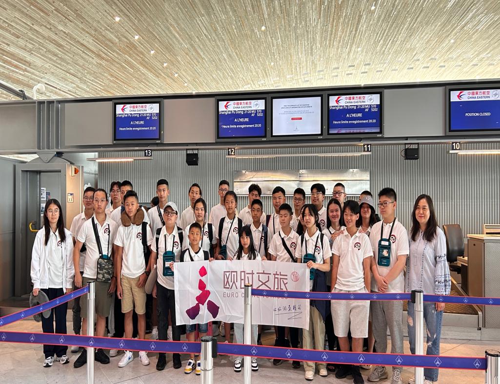 夏令營(yíng)全體成員在巴黎戴高樂(lè)國(guó)際機(jī)場(chǎng)集結(jié)出發(fā)。