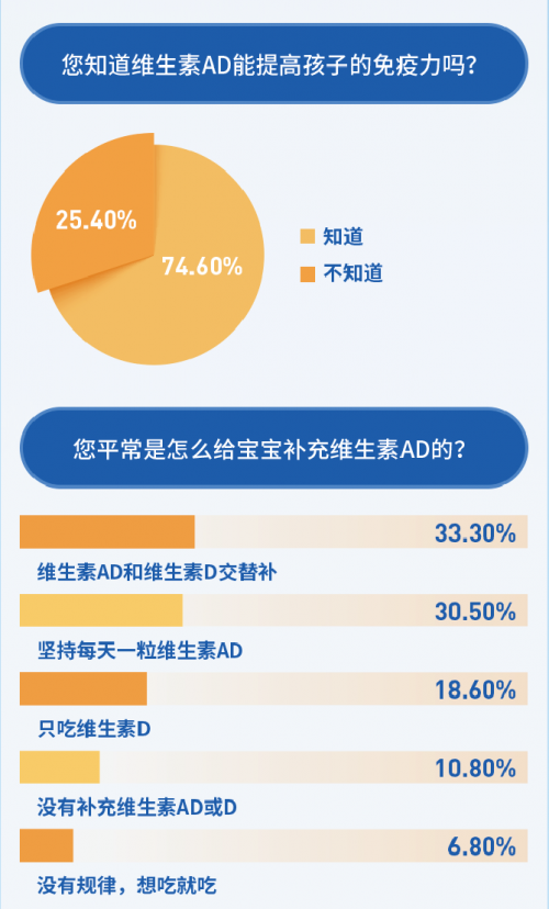 調(diào)查報(bào)告還顯示,雖然7成的家長(zhǎng)認(rèn)可維生素AD對(duì)提高免疫力的作用,但有7成的家長(zhǎng)用錯(cuò)了方法,比如選擇AD和D交替補(bǔ)、只補(bǔ)D不補(bǔ)A、補(bǔ)補(bǔ)停停等。專家提醒,家長(zhǎng)一定要重視孩子日常營養(yǎng)的攝入,堅(jiān)持每天補(bǔ)充維生素AD是最佳方案。