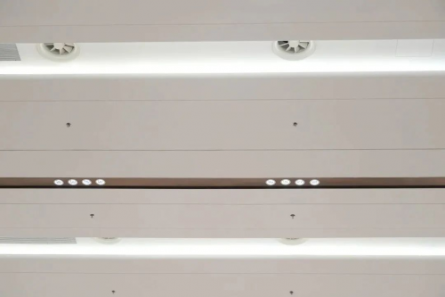 三層交通廳,位于會議中心的兩翼,聯通展廳、公共通道及休息區(qū)域上層空間為玻璃采光頂,精致的走線輔以200余盞筒燈,創(chuàng)造獨特的建筑感觀。