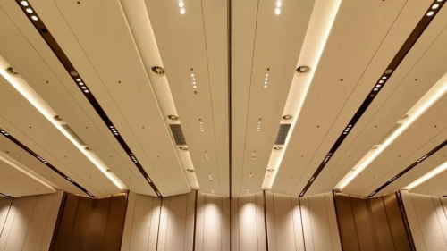 會議門廳,與兩側VIP前室相連,向北聯通室外廣場,挑高最高處達24米,采用香檳金色蜂窩鋁板,整體造型呼應建筑鳳“翼”舒展的形態(tài),向北廣場方向傾斜5°。