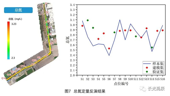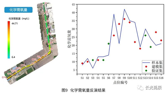精度評定結(jié)果見表2.各水質(zhì)參數(shù)的平均相對誤差均在25%以下,可滿足常態(tài)化、高頻次的全局水質(zhì)檢測需求?;瘜W(xué)需氧量反演誤差稍大是因?yàn)樵摋l河道整體水質(zhì)情況存在較大的空間異質(zhì)性,河道不同河段中有機(jī)物含量差異較大,而水體化學(xué)需氧量與有機(jī)物濃度密切相關(guān),所以這種變化較快的梯度可能會引入一定的誤差,模型也有繼續(xù)優(yōu)化的空間。