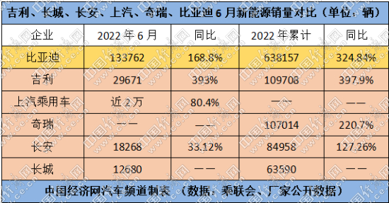 中國經濟網記者通過梳理廠家公開的數據和乘聯會發(fā)布的數據發(fā)現,6月,比亞迪乘用車、吉利、長安乘用車、長城的銷量分別為133762輛、126595輛、118303輛、101186輛,同比分別上漲168.8%%、26%、37.6%、0.52%;上半年累計銷量分別為641350輛、613842輛、629175輛、518525輛,同比分別上漲314.9%、-3%、-4.61%、-16.12%。?