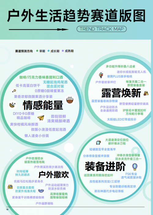 巨量算數(shù) & 算數(shù)電商研究院綜合趨勢(shì)賽道評(píng)估模型,篩選出了 38 個(gè)戶外生活行業(yè)趨勢(shì)賽道,覆蓋運(yùn)動(dòng)用品、戶外用品、箱包、方便食品、酒飲等多板塊,我們認(rèn)為推動(dòng)品類的創(chuàng)新力集中在功能創(chuàng)新、場(chǎng)景創(chuàng)新和情感創(chuàng)新。