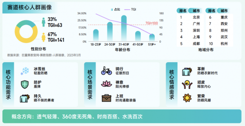 防曬衣賽道解讀:搜索量同比增長(zhǎng) 161.4%,遠(yuǎn)高于行業(yè)整體,該賽道上半年搜索量逐漸上升,下半年搜索量逐漸下降,6月份搜索量最高。興趣群體以女性為主,31-40 歲人群占比高,用戶集中在一線和高溫天氣多發(fā)城市。未來,防曬衣可能會(huì)更加注重輕盈防曬、持久等功能,為消費(fèi)者提供更好的防護(hù)和穿著體驗(yàn),并向輕薄、智能等方向發(fā)展。
