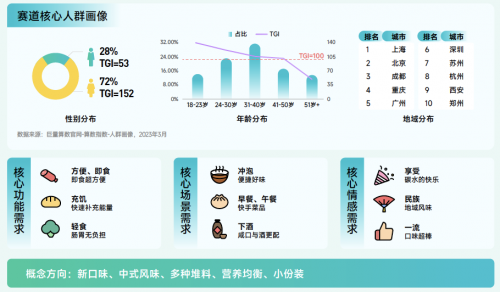 方便食品賽道解讀:2022年3月-2023年4月間搜索量同比增長(zhǎng) 829.6%,遠(yuǎn)高于行業(yè)整體,月度趨勢(shì)波動(dòng)攀升。女性為主,31-40 歲人群占比高;集中在一二線城市。方便食品由于其便宜、快速和方便,逐漸成為出行必備品。正所謂,方便生活,小包裝,大營(yíng)養(yǎng)。在戶外出行中,方便食品助你享受更加自由、無拘束的旅程。