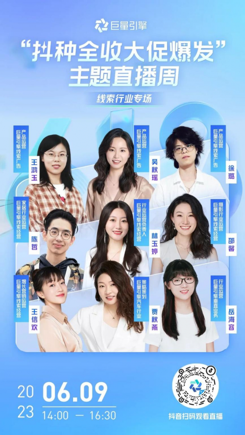 關注“巨量引擎小助手”抖音號,6月9日14:00,來線索行業(yè)618直播專場,了解更多活動政策及作戰(zhàn)攻略。