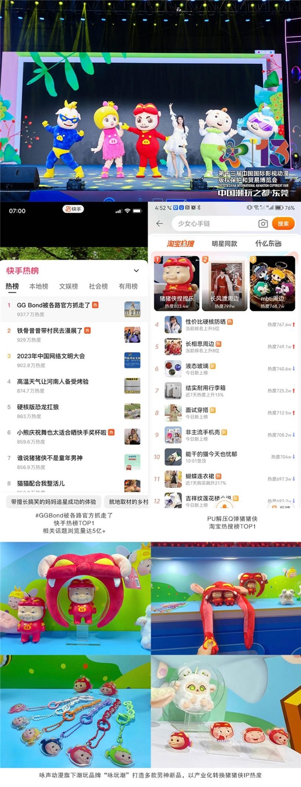本次展會上,豬豬俠率領小伙伴們亮相國漫國潮嘉年華,精彩的現場表演吸引了眾多觀眾圍觀。今年,豬豬俠表情包在各大平臺高頻次曝光,眾多網友以自發(fā)模仿、二創(chuàng)等方式傳播GGBond表情包,男神GGBond相關話題多次登上抖音、快手、微博等各平臺熱榜。同時,詠聲動漫迅速推出相應衍生品承接熱點,實現營銷變現。