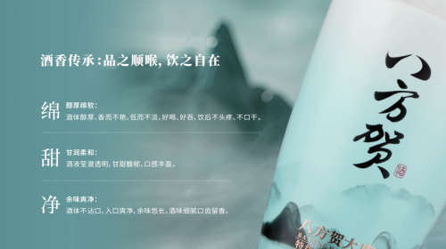 「八方賀特級(jí)清香型白酒」,傳承中華古法釀造工藝彰顯酒體釀造智慧。采用清蒸二次清工藝、地缸發(fā)酵、古法蒸餾的傳統(tǒng)清蒸發(fā)酵法釀造,盡顯清香白酒的醇厚綿軟、甘潤(rùn)柔和;三款白酒宛如歷史的古舊卷軸,在感官的呼喚下,展開了一幅醇香的畫卷。