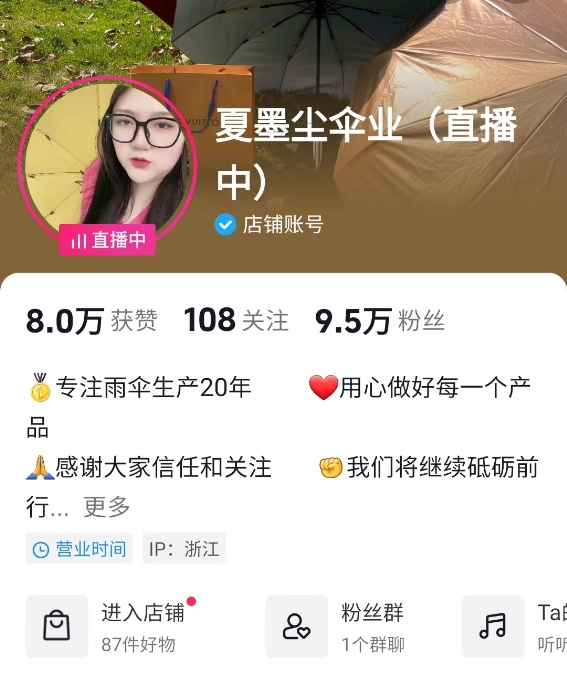 當(dāng)自家店鋪成為網(wǎng)紅店,讓沒做電商的鐘永平有了新的想法。于是,在2020年5月,他決定入局抖音,并取名“夏墨塵傘業(yè)”。