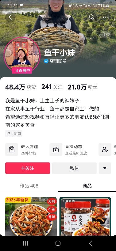 賀麗萍夫婦在抖音開了賬號,取名“辣妹子田園美食”,主打的是小魚小蝦干等地方水特產(chǎn)。前期,他們沒有過多在這個賬號傾注心血,只是發(fā)些短視頻,流量也很一般。