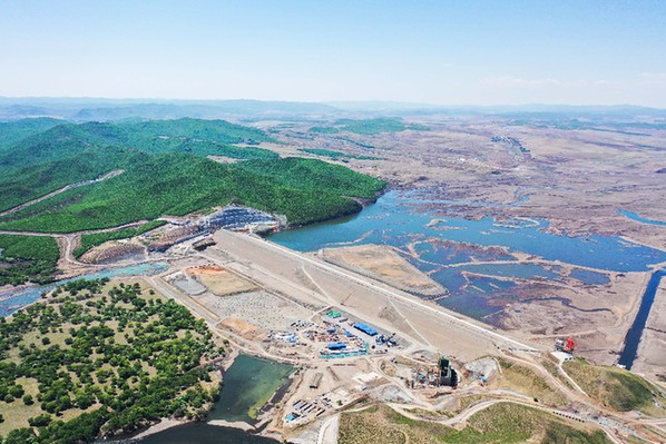內(nèi)蒙古引綽濟遼工程加緊推進。圖為引綽濟遼工程文得根水利樞紐施工現(xiàn)場。新華社記者 劉磊 攝