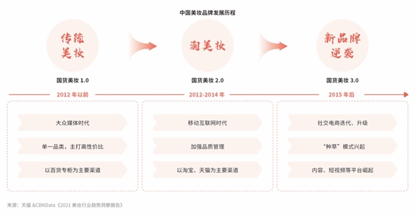 伴隨著大眾媒體、移動(dòng)互聯(lián)網(wǎng)、社交電商的發(fā)展與升級(jí),中國(guó)美妝品牌經(jīng)歷了“傳統(tǒng)美妝→淘美妝→新品牌逆襲”的過(guò)程。目前,國(guó)貨美妝已經(jīng)迎來(lái) 3.0 時(shí)期,依托社交電商占領(lǐng)消費(fèi)者心智。
