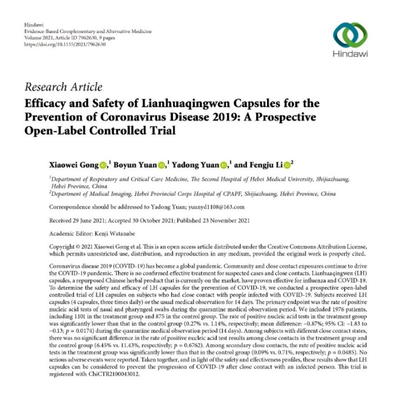 連花清瘟膠囊/顆粒預(yù)防新冠肺炎的作用得到了臨床研究的證實(shí)。前不久,由河北醫(yī)科大學(xué)第二醫(yī)院呼吸與危重癥醫(yī)學(xué)二科主任袁雅冬教授主持開展的“連花清瘟膠囊預(yù)防新型冠狀病毒肺炎”真實(shí)世界研究論文被國(guó)際權(quán)威期刊《循證補(bǔ)充和替代醫(yī)學(xué)》刊發(fā)。該論文指出,連花清瘟膠囊在有效治療流感、新冠肺炎COVID-19的同時(shí),兼具預(yù)防新冠肺炎的作用,為新冠疑似病例和密切接觸者提供了新的治療方案。