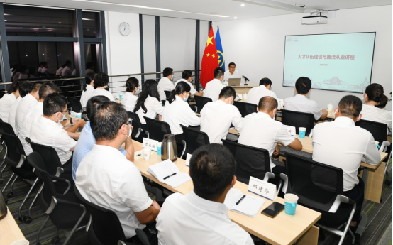 圖為公司紀委書記牛春忠在為優(yōu)訓(xùn)營學(xué)員及近三年新入職員工開展廉潔文化講座。