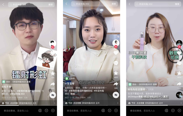 截至目前,活動(dòng)收獲2億+曝光量、節(jié)目播放總量突破7800萬(wàn)次,抖音話題#歡迎光臨302 收獲播放量1.3億+,引起廣泛熱議與共鳴。