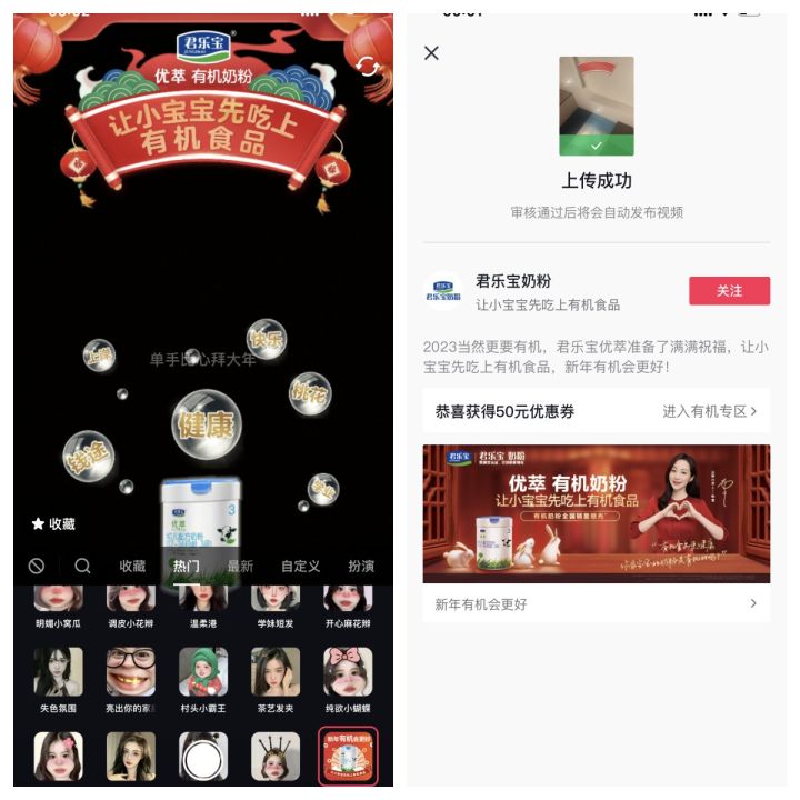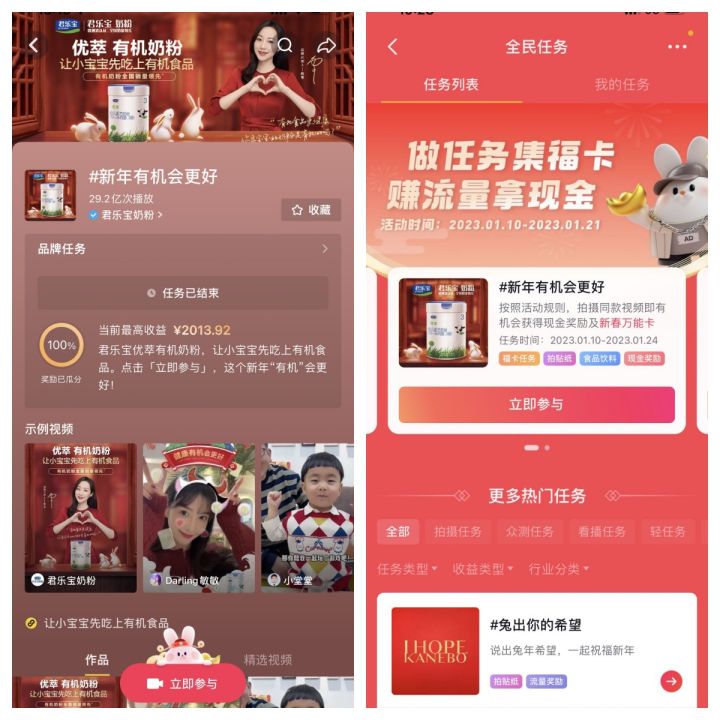 基于新一代母嬰人群所追求沉浸感和參與感,信賴場景式安利、沉浸式感受,因而優(yōu)萃有機奶粉攜手巨量引擎在基礎(chǔ)品牌信息的純曝光宣傳之外,共創(chuàng)了一系列多元互動玩法,如找紅包、集節(jié)氣卡、挑戰(zhàn)賽貼紙等,在點燃新春氛圍的同時加深了品牌與用戶深度互動,尤其是在抖音上發(fā)起的 #新年有機會更好 的話題挑戰(zhàn)賽,優(yōu)萃有機奶粉的有機賣點持續(xù)多次露出,活動各頁面上“優(yōu)萃有機奶粉,讓小寶寶先吃上有機食品”高度吸睛,最大程度覆蓋了用戶的目光所及之處,高密度投放且集中化曝光使得優(yōu)萃有機奶粉品牌價值理念在用戶心智中形成深刻記憶點。