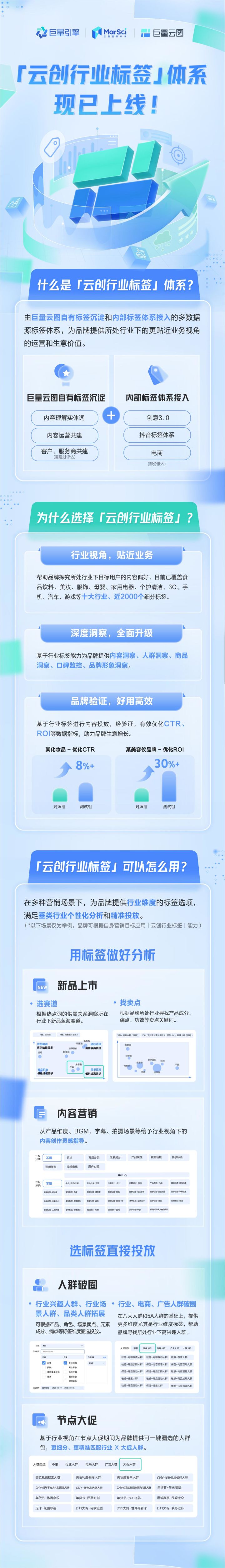 目前,「云創(chuàng)行業(yè)標簽」已覆蓋食品飲料、美妝、服飾、母嬰、家用電器、個護清潔、3C、手機、汽車、游戲等十大行業(yè)、近2000個細分標簽。這些標簽與行業(yè)的具體業(yè)務場景緊密相關(guān),且包含內(nèi)容洞察、人群洞察、商品洞察、口碑監(jiān)控、品牌形象洞察等細分維度洞察。經(jīng)驗證,基于行業(yè)標簽進行內(nèi)容投放,可有效優(yōu)化CTR、ROI等數(shù)據(jù)指標,助力品牌生意增長。