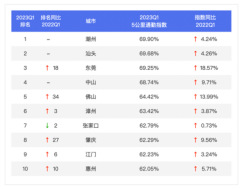 2023年第一季度,百城1小時(shí)通勤指數(shù)榜TOP10主要為二三線城市,其中TOP3城市是潮州、汕頭、中山,通勤一小時(shí)可達(dá)性越高,通勤幸福感越強(qiáng);5公里通勤指數(shù)TOP10城市中有8個(gè)城市位于廣東省,其中佛山、東莞為新一線城市。