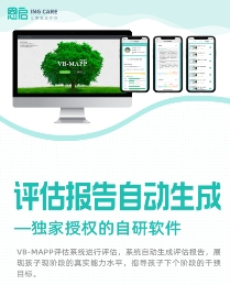 評(píng)估環(huán)節(jié) 評(píng)估報(bào)告自動(dòng)生成!使用獨(dú)家授權(quán)的自研軟件——VB-MAPP評(píng)估系統(tǒng)進(jìn)行評(píng)估,系統(tǒng)自動(dòng)生成評(píng)估報(bào)告,展現(xiàn)孩子現(xiàn)階段的真實(shí)能力水平,指導(dǎo)孩子下個(gè)階段的干預(yù)目標(biāo)。