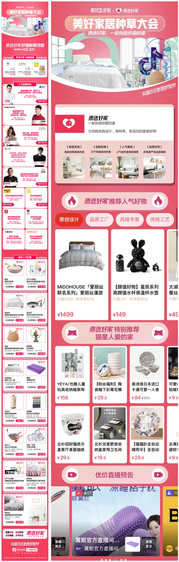 818活動(dòng)伊始,抖音電商消電家居行業(yè)發(fā)起的美好家居種草大會(huì)便吸粉無數(shù),「質(zhì)選好家」通過家居行業(yè)的有趣互動(dòng)話題配合人氣同款品質(zhì)好物推薦、口碑設(shè)計(jì)師專業(yè)好價(jià)等選品指導(dǎo)內(nèi)容,打通「從需求產(chǎn)生到商品銷售爆發(fā)」的體驗(yàn)鏈路,一系列的家居話題探討:衛(wèi)生間搭配什么收納更能搭配你家的整體風(fēng)格,一個(gè)收納空間怎么就一舉兩得成為了居家咖啡館,選一個(gè)枕頭如何讓你的睡眠質(zhì)量更好,養(yǎng)貓人選什么樣的沙發(fā)套更合適?......是「質(zhì)選好家」挖掘用戶需求心聲后給予用戶的美好家居購買提案,「質(zhì)選好家」讓商家不再只是商品的提供者,而是在以家為場景的消費(fèi)路徑中聯(lián)合商家為消費(fèi)者提供更多新消費(fèi)靈感,讓消費(fèi)者更容易找到自己真正適合的商品,找到適合自己的一站式家居解決方案。同時(shí)將對(duì)于家的美好向往通過商品售賣提供給消費(fèi)者,真正實(shí)現(xiàn)「質(zhì)選好家」與消費(fèi)者「一起創(chuàng)造你愛的家」的內(nèi)核訴求。