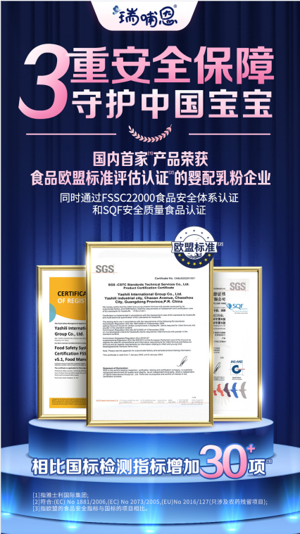 秉承“消費者第一第一第一”的企業(yè)價值觀,蒙牛瑞哺恩對標(biāo)全球最嚴(yán)標(biāo)準(zhǔn),全面啟動歐盟標(biāo)準(zhǔn)升級,憑借著高標(biāo)準(zhǔn)、嚴(yán)要求,瑞哺恩國內(nèi)4家工廠均順利拿下國際權(quán)威認(rèn)證機(jī)構(gòu)SGS授予的歐盟食品標(biāo)準(zhǔn)認(rèn)證,蒙牛瑞哺恩更成為國內(nèi)首款通過食品歐盟標(biāo)準(zhǔn)評估認(rèn)證的嬰配乳粉產(chǎn)品,同時還獲得SGS授予的FSSC2200食品安全體系認(rèn)證和SQF食品安全質(zhì)量認(rèn)證,代表著蒙牛瑞哺恩旗下的嬰幼兒配方奶粉的生產(chǎn)已達(dá)到國際一流水平。