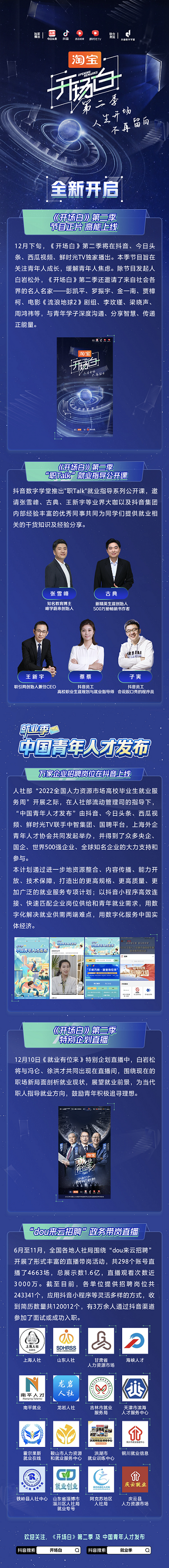 值得一提的是,第一季節(jié)目此前在高校大學生尤其是應屆生就業(yè)人群中的火爆影響力,得到了全社會的聚焦關注,今年12月,恰逢人社部開展落實”2022年全國人力資源市場高校畢業(yè)生就業(yè)服務周專場活動”,第二季《開場白》將以此為契機,充分響應人社部號召,將政府幫扶與市場化社會化就業(yè)相結合、更好地打通社會企業(yè)與校園就業(yè)連接的倡導,面向職業(yè)技術學校畢業(yè)生等重點人群發(fā)力,第二季《開場白》將更加深入校園落地就業(yè)實際服務,助力應屆生打通就業(yè)通道,提升就業(yè)自信,加強就業(yè)服務,提升就業(yè)成果;12月5日起,抖音更將繼續(xù)上線就業(yè)招聘專區(qū),可實現(xiàn)一鍵直達各招聘平臺抖音小程序,進行崗位的篩選與投遞,加速助力職業(yè)技術學校畢業(yè)生人群在節(jié)目線下落實就業(yè);第二季《開場白》也將借助專家學者嘉賓們的影響力,通過具有穿透力的價值內(nèi)容議題,向廣大高校學子特別是應屆生人群,傳遞積極的就業(yè)觀、塑造健康的就業(yè)心態(tài),共建一個更加有利于高校就業(yè)環(huán)境、有利于Z世代青年人長效發(fā)展的市場化社會化就業(yè)生態(tài)。