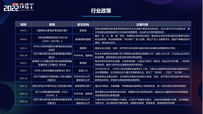 二十大報(bào)告里面對(duì)教育領(lǐng)域的發(fā)展也提出了明確的目標(biāo),就是要建成教育強(qiáng)國(guó)、科技強(qiáng)國(guó)、人才強(qiáng)國(guó)、文化強(qiáng)國(guó)等,尤其在教育、科技、人才方面,這都是跟我們行業(yè)息息相關(guān)的,也是我們行業(yè)機(jī)構(gòu)在業(yè)務(wù)布局和企業(yè)經(jīng)營(yíng)方面需要重點(diǎn)關(guān)注的方向。