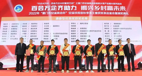 2月24日,由廈門市工商聯(lián)(總商會)、安溪縣人民政府主辦,廈門市安溪商會承辦,中共安溪縣委統(tǒng)戰(zhàn)部、安溪縣茶業(yè)管理委員會辦公室、安溪縣工商聯(lián)協(xié)辦的2022年“廈門市安溪商會杯”安溪鐵觀音秋季茶王賽獲獎茶品鑒會暨頒獎典禮在廈門佰翔五通酒店盛大舉行。本次活動是為了進(jìn)一步落實(shí)廈門市工商聯(lián)和安溪縣人民政府提出的“萬企興萬村·百會萬企興村富民行動”計劃——廈門市安溪商會助推家鄉(xiāng)茶產(chǎn)業(yè)振興活動,也是“廈門企業(yè)家日”配套活動之一。