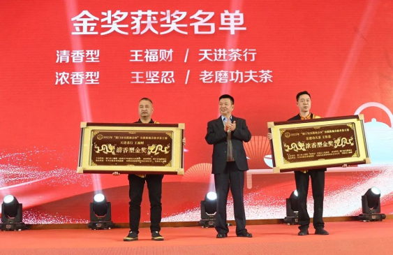 安溪縣政協(xié)副主席陳振仕和廈門市安溪商會黨委書記、執(zhí)行會長李進(jìn)江頒發(fā)清香型優(yōu)質(zhì)獎牌匾和證書