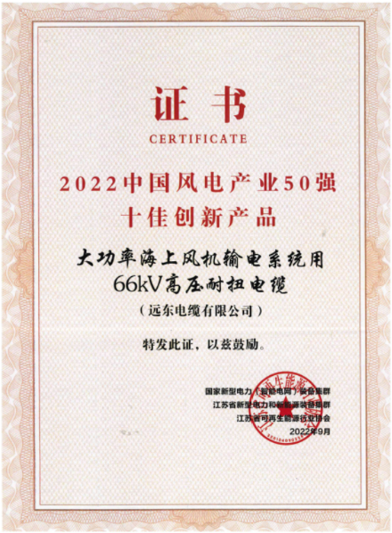 該系列產(chǎn)品主要應(yīng)用于海上大功率風電機組電力傳輸,不僅可以有效地提升傳輸容量和效率,降低系統(tǒng)損耗,還可以實現(xiàn)全壽命周期內(nèi)安全可靠運行,是大功率海上風電機組亟需的核心部件,也是未來海上大功率風力發(fā)電技術(shù)發(fā)展趨勢。并成功應(yīng)用于華電臺州玉環(huán)、福清興化灣等多個海上風電場等項目,還被授予了國家工信部頒發(fā)的“制造業(yè)單項冠軍”、2022中國風電產(chǎn)業(yè)50強“十佳創(chuàng)新產(chǎn)品”等多項榮譽,獲得了從國家到行業(yè)的高度認可,夯實了公司在風電電纜行業(yè)的領(lǐng)軍地位。