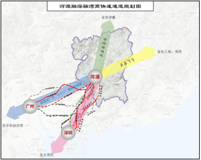 河源到廣州的贛深-廣汕高鐵、廣河高鐵2條高鐵通道,廣河、廣紫2條高速公路通道,廣州-惠州-河源1條城際軌道