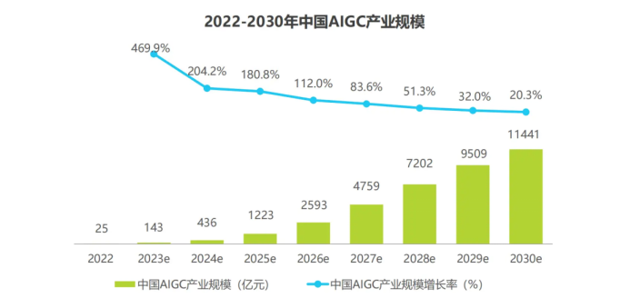 報告指出,2023年中國AIGC產(chǎn)業(yè)規(guī)模約為143億元,隨后進(jìn)入大模型培育期,持續(xù)打造與完善底層算力基建、大模型商店平臺等新型基礎(chǔ)設(shè)施,以此孕育成熟技術(shù)與產(chǎn)品形態(tài)并將其對外輸出。到2030年中國AIGC產(chǎn)業(yè)規(guī)模有望突破萬億元,達(dá)到11441億元。