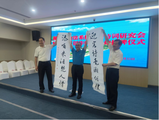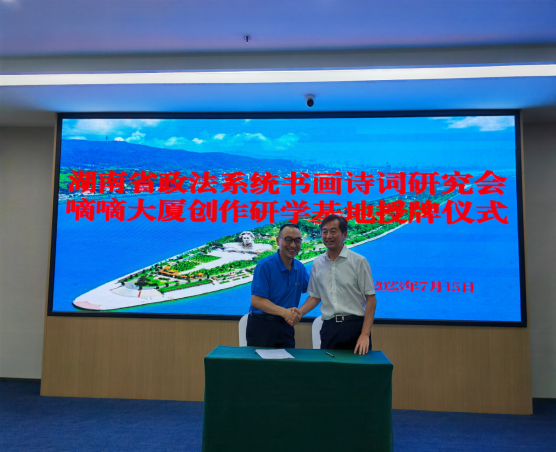詩以言志,文以化人。以法護(hù)商,以商促文。7月15日上午,坐落于長沙市芙蓉區(qū)“中央文化區(qū)”的嘀嘀大廈五樓會議室高朋滿座,熱鬧非凡?!昂鲜≌ㄎ幕粥执髲B創(chuàng)研基地”簽約暨掛牌儀式在此隆重舉行。省政法系統(tǒng)書畫詩詞研究會主席團成員彭對喜,副會長劉慶富;詩詞分會主席陳嶺及副主席賀曦、周加良、江世炎;書法分會主席陳祥松、副主席吳若順;長沙法官文聯(lián)副主席胡軍軍等領(lǐng)導(dǎo)和嘉賓出席活動。