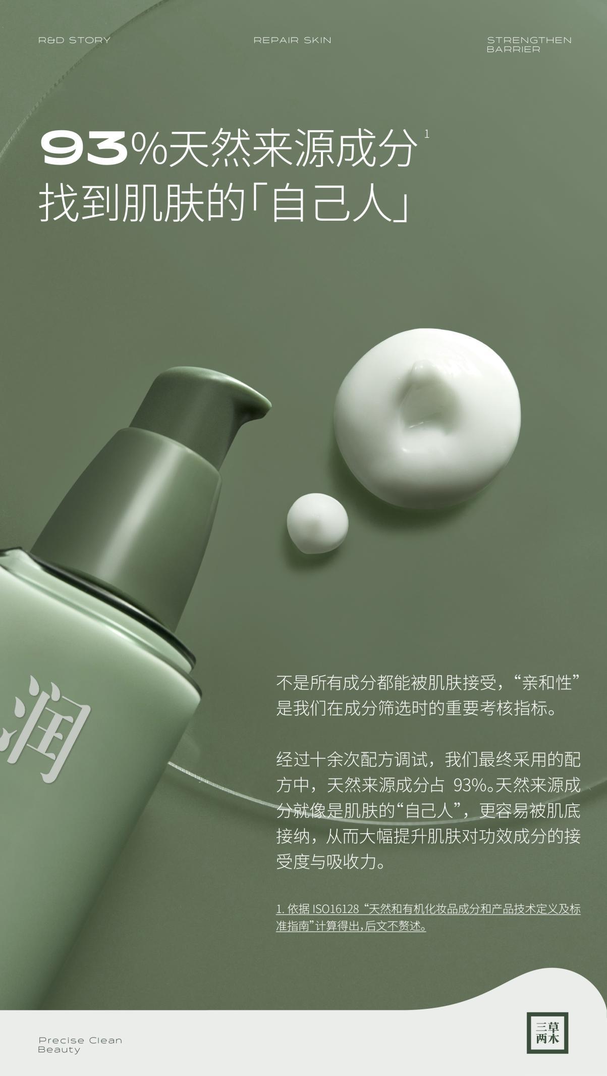 分膚定制專屬方案的搭建同樣離不開(kāi)活性成分的精準(zhǔn)篩選。為了幫助消費(fèi)者深度潤(rùn)澤肌膚,三草兩木選取崖壁上的潤(rùn)活精粹——鐵皮石斛提取物,用自然之力降噪保濕,令肌膚水潤(rùn)、嫩滑、透亮;4D透明質(zhì)酸鈉+PENTAVITIN?鎖水磁石的強(qiáng)力組合能夠有效鎖住游離水,幫助調(diào)控皮膚的含水量,進(jìn)一步滋潤(rùn)、光滑、細(xì)膩皮膚。更讓人驚喜的是,在三草兩木經(jīng)由十余次調(diào)試敲定的最終配方中,93%的成分都是天然來(lái)源,而且不添加任何對(duì)皮膚有風(fēng)險(xiǎn)的成分,敏感肌膚使用也完全沒(méi)有負(fù)擔(dān)。
